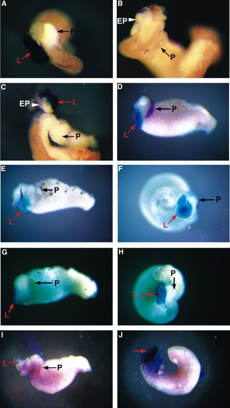 Figure 4. Liver Gene Expression in Transgenic Gut Preparations(AâC) Transthyretin (TTR) RNA expression. (A) In wild-type preparations, expression is only seen within the liver. (B and C) TTR-Xlhbox8-VP16 transgenics. (B) In this case, there is complete conversion of liver to pancreas, and transthyretin expression has been completely suppressed. (C) In this case, half the liver has changed into pancreas, and transthyretin expression is seen only in the other half. In all examples, nontransgenic guts were stained simultaneously with transgenic guts, and the staining reaction was stopped in both when the nontransgenic expression was clearly evident.(D) Liver differentiation begins normally in TTR-Xlhbox8-VP16 tadpoles. Xhex (blue) and GFP (magenta, driven by the elastase promoter) expression. GFP RNA is seen only in the dorsal and ventralpancreas at stage 40; no GFP expression is detected in the liver. Xhex expression is normal at this stage and is present throughout the whole liver.(EâH) Timing of liver differentiation in normal nontransgenic tadpoles: from 3 days, the liver has become a separate organ, with Xhex and AMBP expressed throughout. (E) Xhex RNA at stage 40 (3 days). (F) Xhex RNA at stage 45 (5 days). (G) AMBP RNA at stage 40 (3 days). (H) AMBP expression at stage 45 (5 days).(I and J) The TTR promoter becomes active in Xenopus tadpoles only after the liver has differentiated. This shows RNA in situ hybridization for GFP driven by the TTR promoter. (I) At stage 40 (3 days), no GFP expression is detected. (J) GFP expression is first detected at stage 44 (4 days).
