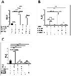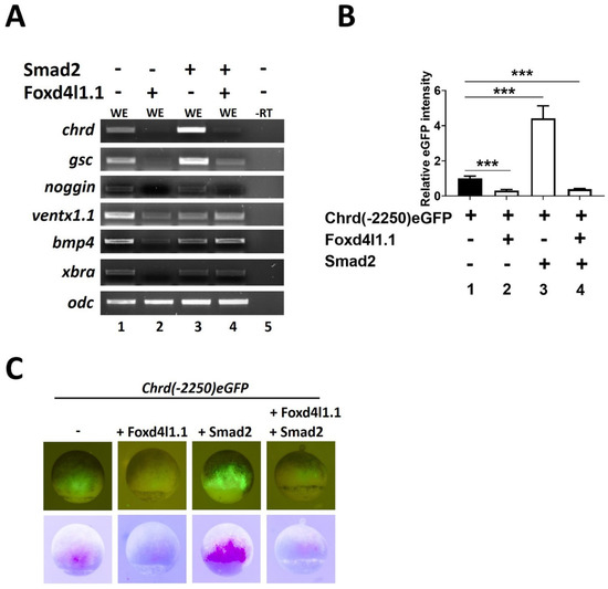 Figure 1. Ectopic expression of Foxd4l1.1reduced dorsal mesoderm (organizer) and ectodermal gene expression during gastrula. Xenopus embryos were injected with Foxd4l1.1 and Smad2 (1 ng/embryo) at the one-cell stage. RT expression was analyzed at stage 11 in whole embryos (WE): (A) RT expression of different germ-layer-specific markers was analyzed; (B and C) chrd(−2250)eGFP was injected alone or co-injected with Foxd4l1.1, Smad2, or both at the one-cell stage; eGFP fluorescent analysis was performed at stage 11: (B) quantification of chrd(−2250)eGFP fluorescent intensity (bar 1) co-injected with Foxd4l1.1 (bar 2), co-injected with Smad2 (bar 3), and Foxd4l1.1 plus Smad2 (bar 4); (C) chrd(−2250)eGFP fluorescence along with co-injection with Foxd4l1.1 or Smad2 or both, separately (at stage 10/10.5) as indicated. In the lower panel, inverted color images generate the pink color for eGFP fluorescent positive areas and reduce the background seen. -RT (No RT) served as a negative control, and uninjected whole embryo (WE) served as a positive control. *** p ≤ 0.001.