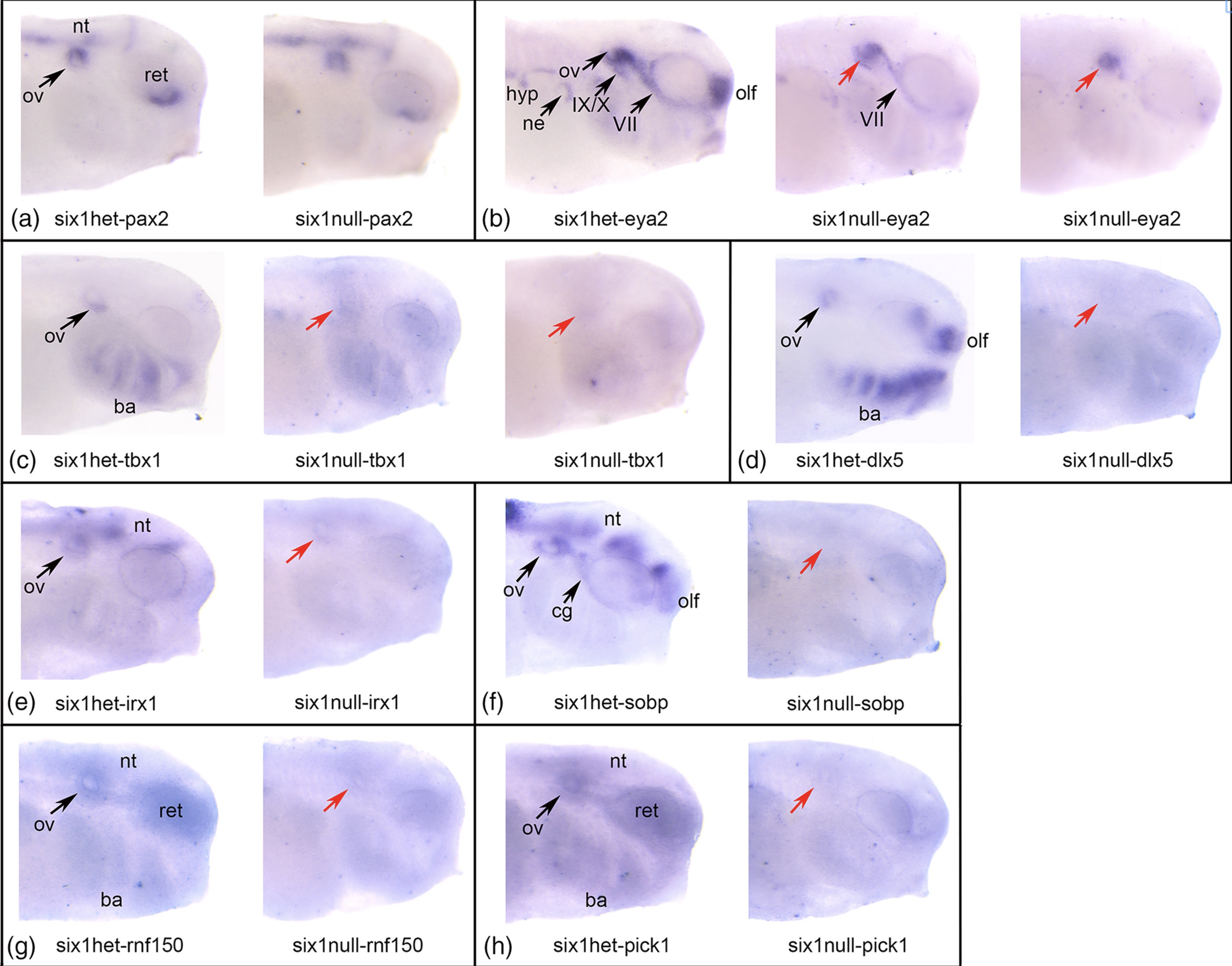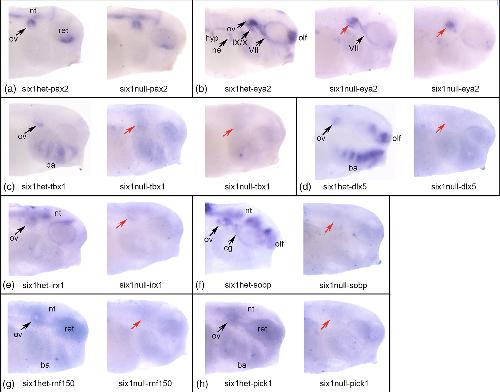 Figure 2. In situ hybridization of six1+/â and six1 â/â X. tropicalis larvae. (a) Left image: pax2 expression in a six1+/â larva. Staining is strong in the otic vesicle (ov), retina (ret), and neural tube (nt). Right image: pax2 expression in a six1â/â larva is indistinguishable from the heterozygous sibling. (b) Left image: eya2 expression in a six1+/â larva. Staining is strong in ov, olfactory placode (olf), VII and IX/X cranial ganglia, nephric mesoderm (ne) and hypaxial muscle precursors (hyp). Middle image: eya2 expression in a six1â/â larva with a partial effect. ov (red arrow) and VIIg staining appears normal, ne and hyp staining appears reduced, and IX/Xg and olf staining is not detectable. Right image: eya2 expression in a six1â/â larva with a severe effect. Only ov staining (red arrow) is detected and ov is smaller than normal. (c) Left image: tbx1 expression in a six1+/â larva. Staining is strong in ventral ov and branchial arches (ba). Middle image: tbx1 expression in a six1â/â larva with a partial effect. ov (red arrow) and ba staining is reduced but not missing. Right image: tbx1 expression in a six1â/â larva with a complete loss of staining in the ov (red arrow) and ba. (d) Left image: dlx5 expression in a six1+/â larva. Staining is strong in ov, ba, and olf. Right image: Staining in ov (red arrow), ba and olf is not detected. (e) Left image: irx1 expression in a six1+/â larva. Staining is strong in ov and nt. Right image: irx1 expression in a six1â/â larva. Staining in ov (red arrow) and nt is not detected. (f) Left image: sobp expression in a six1+/â larva. Staining is strong in ov, VIIg (cg), olf, and nt. Right image: sobp expression in a six1â/â larva. Staining in ov (red arrow), cg, olf, and nt is not detected. (g) Left image: rnf150 expression in a six1+/â larva. Staining is strong in ov, ba, ret, and nt. Right image: rnf150 expression in a six1â/â larva. Staining in ov (red arrow), ret, and nt is not detected, and greatly reduced in ba. (h) Left image: pick1 expression in a six1+/â larva. Staining is strong in ov, ba, ret, and nt. Right image: pick1 expression in a six1â/â larva. Staining in ov (red arrow), ba, ret, and nt is not detected. All views are lateral with anterior to the right and dorsal to the top.