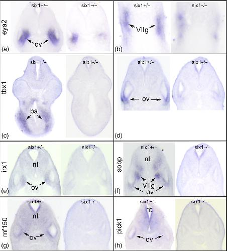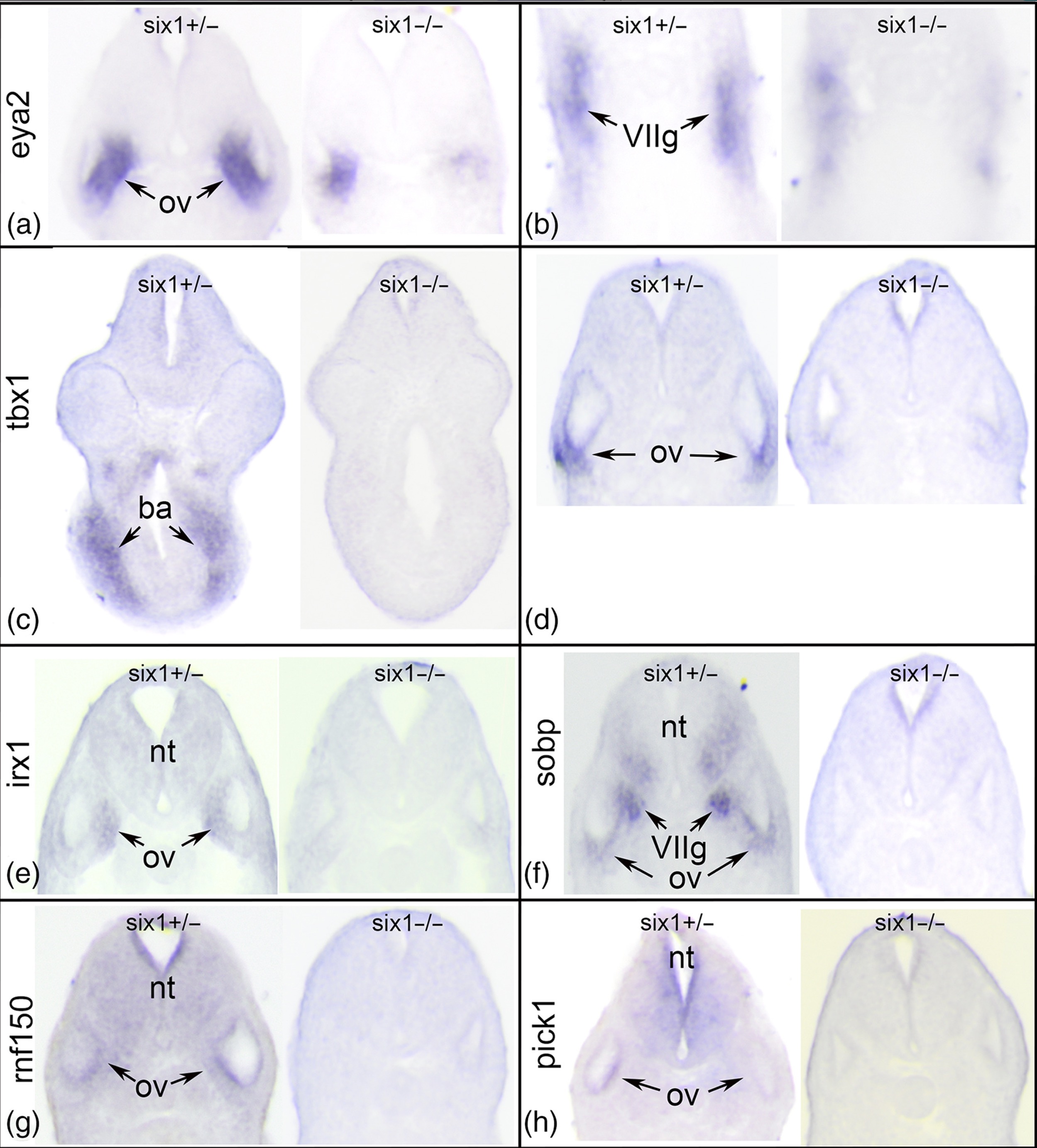 Figure 3.Changes in gene expression after loss of one (six1+/â) or two (six1â/â) alleles of six1. (a) Sections through the otic vesicle (ov) of six1 -heterozygous (left) and six1-null larva processed for eya2 expression. Note the smaller domain of eya2 expression in the null ov. (b) Sections through the facial ganglion placode (VIIg) of six1-heterozygous (left) and six1-null larva processed for eya2 expression. Note the discontinuous nature of eya2 expression in the null VIIg. (c) Sections through the branchial arches (ba) of six1-heterozygous (left) and six1-null larva processed for tbx1 expression. Note the lack of tbx1 expression in the null ba. (d) Sections through the ov of six1-heterozygous (left) and six1-null larva processed for tbx1 expression. Note the lack of tbx1 expression in the null ov. (e) Sections through the ov of six1-heterozygous (left) and six1-null larva processed for irx1 expression. Note the lack of irx1 expression in the null neural tube (nt) and ov. (f) Sections through the ov of six1-heterozygous (left) and six1-null larva processed for sobp expression. Note the lack of sobp expression in the null ventral nt, VIIg, and ov. (g) Sections through the ov of six1-heterozygous (left) and six1-null larva processed for rnf150 expression. Note the lack of rnf150 expression in the null nt and ov. (h) Sections through the ov of six1-heterozygous (left) and six1-null larva processed for pick1 expression. Note the lack of pick1 expression in the null nt and ov. All sections are in the transverse plane oriented with dorsal to the top.