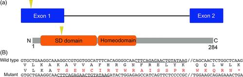 zFigure 1. Generation of six1 mutant X. tropicalis line. (a) Schematic outline of genomic six1 locus and Six1 protein. Yellow arrowhead demarcates the relative location of sgRNA target sequence and mutations in this region are expected to disrupt the proteinâprotein interaction domain (SD). (b) Alignment of wild-type and Xtr.six1em2Horb mutant nucleotide sequence with the â28âbp deletion. Underlined region defines where the mutant and wild-type sequence are identical after the 28âbp deletion. Amino acid sequence is included to show frameshift with resulting stop codon 36 amino acids downstream.