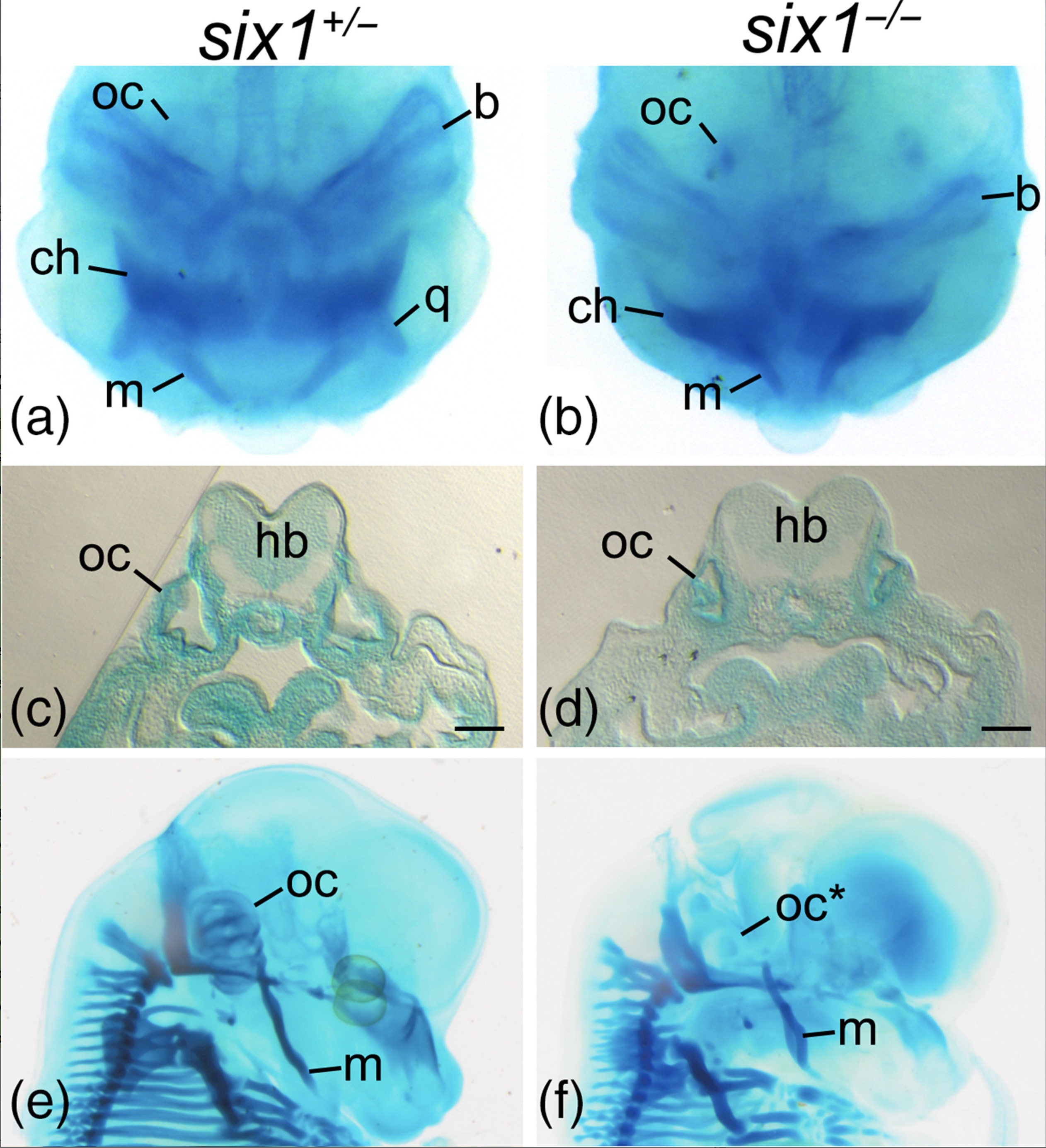 Figure 4.Loss of six1 causes craniofacial dysmorphologies. (a and b) Whole-mount Alcian blue staining of Xenopus tropicalis tadpoles shows that while six1-heterozygotes (six1+/â) present no detectable defects in the branchial arch-derived craniofacial cartilages, six1-nulls (six1â/â) have hypoplastic and deformed Meckel's (m), quadrate (q), ceratohyal (ch), and branchial arch (b) cartilages and hypoplastic otic capsule (oc). (c and d) Transverse section of tadpoles in (a) and (b) at the level of the otic capsule (oc) showing hypoplasia of this structure in six1-null tadpoles (d). hb, hindbrain. Bar. 100 μm. (e and f) Whole-mount Alcian blue staining of E14.5 mouse embryos showing absent otic capsule (oc*) and deformed Meckel's cartilage (m) in Six1-null embryos.