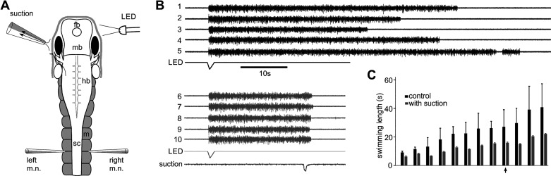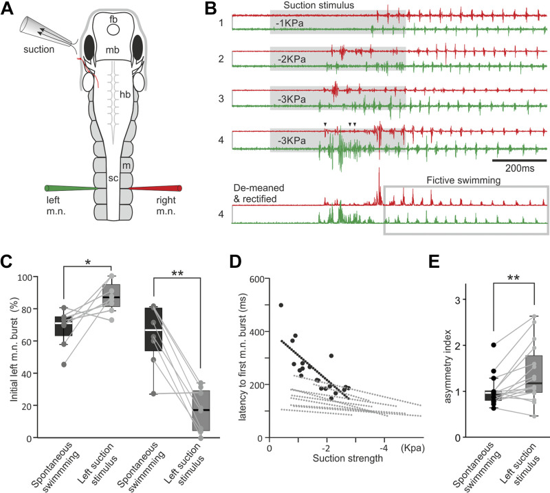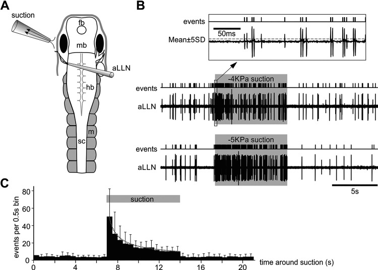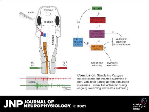 Xenopus laevis has a lateral line mechanosensory system throughout its full life cycle, and a previous study on prefeeding stage tadpoles revealed that it may play a role in motor responses to both water suction and water jets. Here, we investigated the physiology of the anterior lateral line system in newly hatched tadpoles and the motor outputs induced by its activation in response to brief suction stimuli. High-speed videoing showed tadpoles tended to turn and swim away when strong suction was applied close to the head. The lateral line neuromasts were revealed by using DASPEI staining, and their inactivation with neomycin eliminated tadpole motor responses to suction. In immobilized preparations, suction or electrically stimulating the anterior lateral line nerve reliably initiated swimming but the motor nerve discharges implicating turning was observed only occasionally. The same stimulation applied during ongoing fictive swimming produced a halting response. The anterior lateral line nerve showed spontaneous afferent discharges at rest and increased activity during stimulation. Efferent activities were only recorded during tadpole fictive swimming and were largely synchronous with the ipsilateral motor nerve discharges. Finally, calcium imaging identified neurons with fluorescence increase time-locked with suction stimulation in the hindbrain and midbrain. A cluster of neurons at the entry point of the anterior lateral line nerve in the dorsolateral hindbrain had the shortest latency in their responses, supporting their potential sensory interneuron identity. Future studies need to reveal how the lateral line sensory information is processed by the central circuit to determine tadpole motor behavior.NEW & NOTEWORTHY We studied Xenopus tadpole motor responses to anterior lateral line stimulation using high-speed videos, electrophysiology and calcium imaging. Activating the lateral line reliably started swimming. At high stimulation intensities, turning was observed behaviorally but suitable motor nerve discharges were seen only occasionally in immobilized tadpoles. Suction applied during swimming produced a halting response. We analyzed afferent and efferent activities of the tadpole anterior lateral line nerve and located sensory interneurons using calcium imaging.