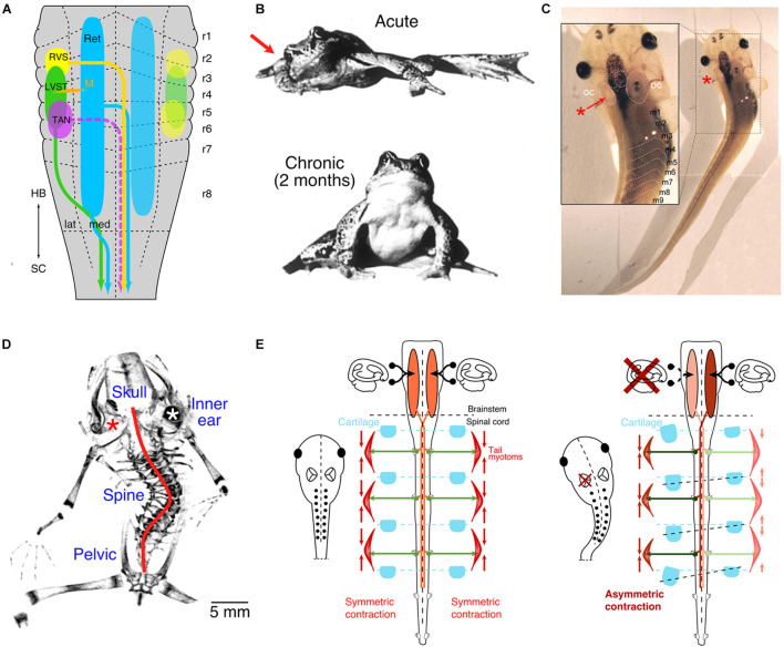 FIGURE 1. Vestibulo-spinal projections and impact of unilateral vestibular impairments. (A) Schematic depicting the segmental origins (color-coded) of vestibulo-spinal and vestibulo-reticulo-spinal pathways. (B) Photographs of a ranid frog immediately (upper) and 2 months (lower) after a unilateral vestibular lesion on the right side (red arrow). (C) Photograph of a Xenopus laevis tadpole immediately after unilateral removal of the vestibular endorgans in the left inner ear (red *, see inset). (D) Micro-CT scan of the skeleton of a post-metamorphic frog after removal of the left inner ear endorgans (red *) at mid-larval stage; the red line indicates the scoliotic deformation. (E) Schematic depicting descending vestibular pathways, spinal motor activity, contraction of axial muscles and relative arrangement of skeletal elements in controls (left panel) and after unilateral labyrinthectomy on the left side (right panel). LVST, lateral vestibulo-spinal tract; m1–9, myotome 1–9; M, Mauthner cell; RVS, rostral vestibulo-spinal tract; OC, otic capsule; r1–8, rhombomere 1–8; TAN, tangential vestibular nucleus; lat, lateral; med, medial; HB, hindbrain; SC, spinal cord; Ret, reticular formation. (A,C,D) From Lambert et al. (2013); (B), from Dieringer (1995) with permission from Elsevier (E), from Lambert et al. (2009).
