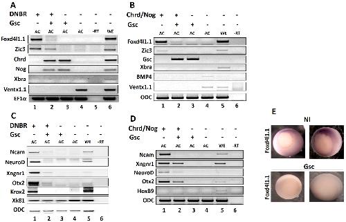 3Flag-gsc (1 ng/embryo), dnbr (0.5 ng/embryo), chordin (0.5 ng/embryo) and noggin (0.5 ng/embryo) (Chrd/Nog) were injected at one-cell stage and the AC explants were dissected at stage 8 to grow until (A and B) stage 11 and (C and D) stage 24. The expression profiles of different germ layer specific marker genes were analyzed by RT-PCR. No RT (no reverse transcriptase added) served as a negative control while WE (whole embryos) served a positive control. (E) 3Flag-gsc (1 ng/embryo) mRNA was injected into one cell embryos, and the injected embryos and non-injected ones (control) were processed for whole mount in situ hybridization (WISH) with anti-sense foxd4l1.1 probe at stage 11.