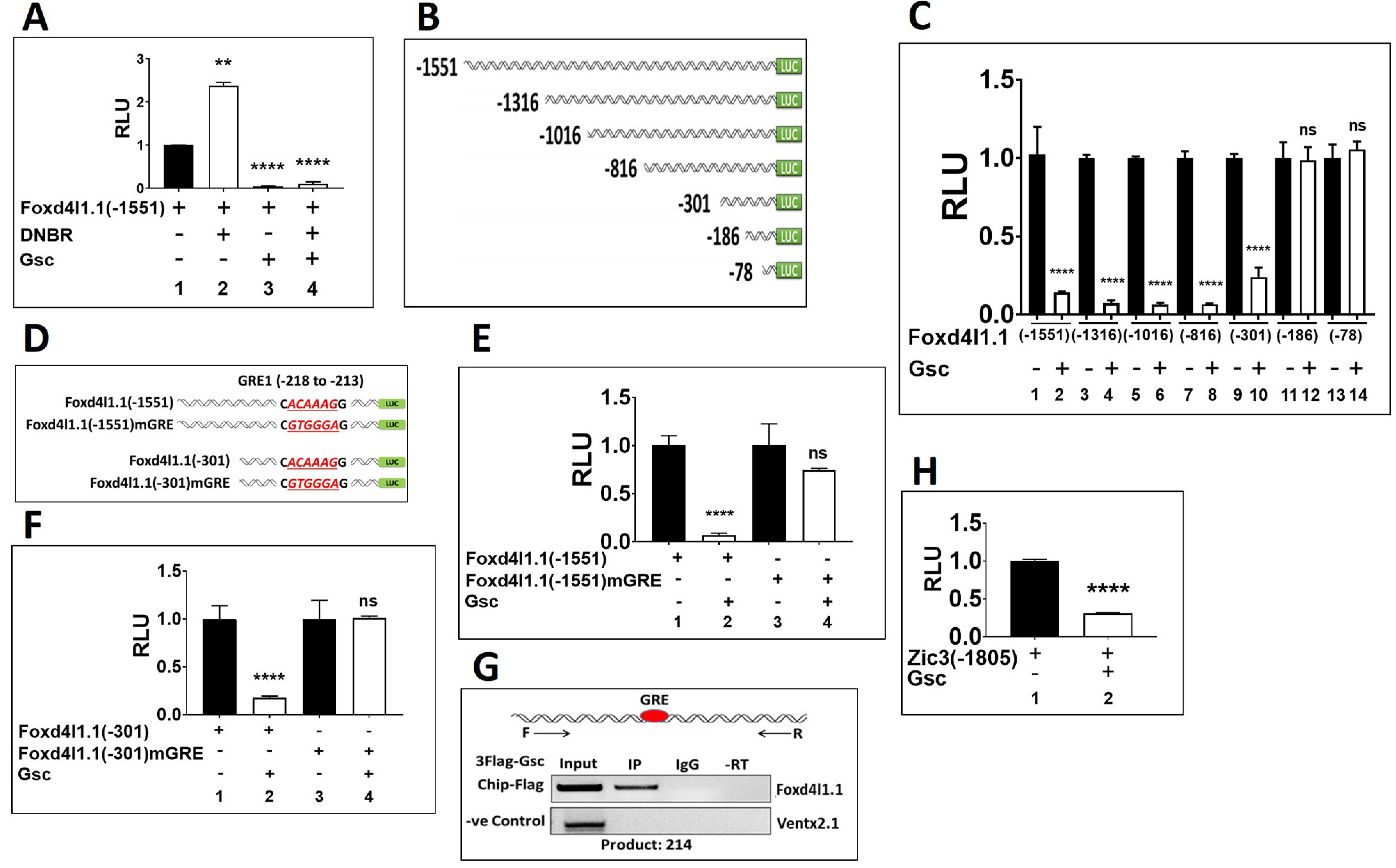 Fig. 3. Abolishment of the repressional activity of Gsc by site-directed mutagenesis of GRE within the foxd4l1.1(â1551) reporter construct. (A) foxd4l1.1(â1551) (40 pg/embryo), dnbr (1 ng/embryo), and 3Flag-gsc (1 ng/embryo) were injected at one-cell stage and reporter assay was performed at stage 11. RLU, relative reporter activity. (B) Schematic representation of serially-deleted foxd4l1.1(â1551) promoter constructs. (C) Serially-deleted foxd4l1.1 (40 pg/embryo) promoter constructs were injected with and without 3Flag-gsc (1 ng/embryo) at one-cell stage and relative promoter activity were measured at stage 11. (D) Site-directed mutagenesis scheme for foxd4l1.1(â1551) and foxd4l1.1(â301) promoter constructs, target sequences highlighted (red color and italic). (E and F) Relative reporter assay of foxd4l1.1(â1551), foxd4l1.1(â1551)mGRE, foxd4l1.1(â301), and foxd4l1.1(â301)mGRE with or with gsc were performed at stage 11. (G) 3Flag-gsc was injected at one-cell stage and ChIP-PCR was performed at stage 11. Specific primers of Foxd4l1.1 promoter region (containing GRE) were used for amplification, while ventx2.1 served as negative control. (H) zic3(â1805) reporter construct was injected (40 pg/embryo) with or without 3Flag-gsc (1 ng/embryo) and reporter assay was performed at stage 11. **P ⤠0.01; ****P ⤠0.0001; ns, non-significance.