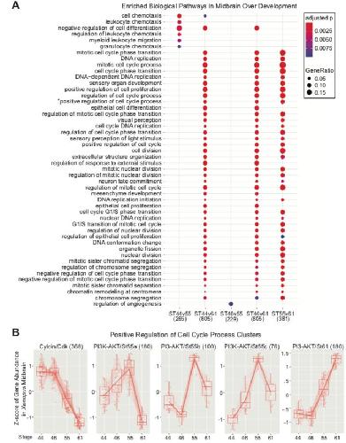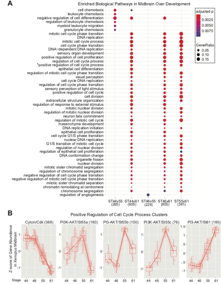 Figure 2. Enriched biological pathways in the Xenopus midbrain across developmental stages. A) GO biological pathway analysis showing enriched sets of genes differentially expressed between stages of tadpolemidbrain development. Dot size corresponds to the proportion of differentially expressed genes associated with the biological pathway, and dot color refers to the adjusted p-value. The numbers along the x-axis correspond to the total number of genes differentially expressed in each comparison. B) Clusters of genes differentially expressed during tadpolemidbrain development that are associated with the âPositive Regulation of Cell Proliferationâ GO category. The five clusters shown are Cyclin/Cdks (368 genes), PI3K-AKT/St55a-c, and PI3K/St61, numbers in parentheses indicates the number of genes in each cluster. The Cyclin/Cdk cluster is enriched in cell cycle-related genes at stages 44-46 (p<0.001) and the remaining clusters are enriched in PI3K-AKT pathway associated genes (St55a-c, p = 0.019; St61, p<0.001).