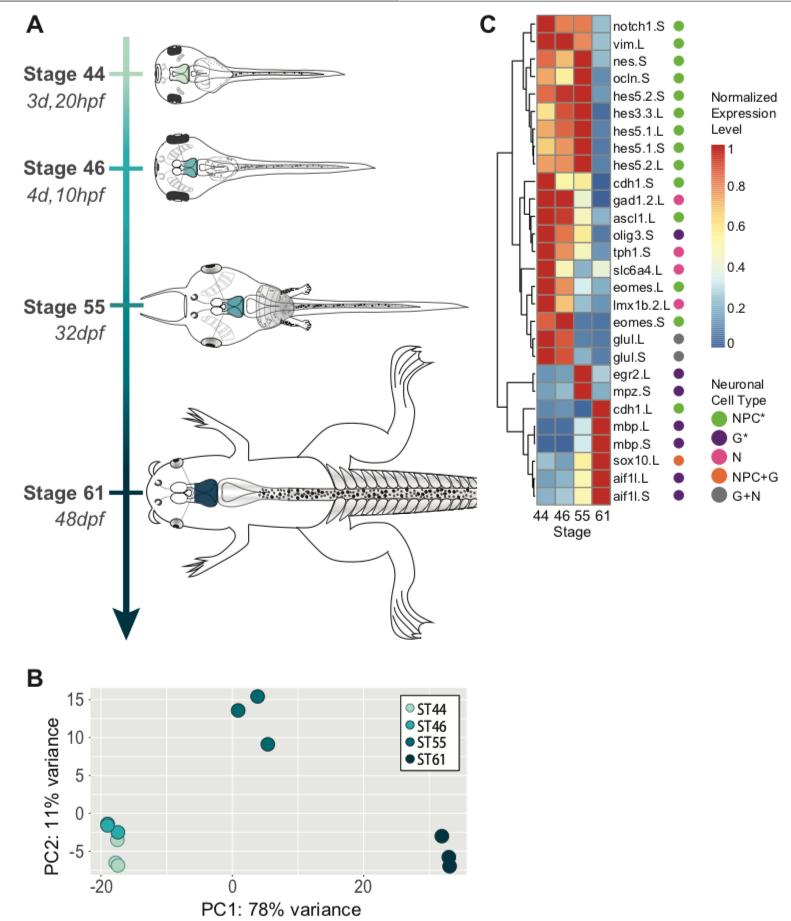 A) X. laevis developmental stages sequenced based on Nieuwkoop and Faber, 1956 (hpf and dpf indicate hours/days post fertilization). B) Principal component analysis of samples collected from the X. laevis midbrain (MB) at developmental stages 44, 46, 55, and 61. Colors correspond to developmental stages in Figure 1A. C) Heat map of cell type marker expression over tadpolemidbrain development. Cell types are categorized for genes listed as NPC, neural progenitor cell (including neuroepithelial cells, radial glia, intermediate progenitors, and immature neurons); G, glial cell (including mature oligodendrocytes, Schwann cells and Schwann cell precursors, astrocytes, and microglia); N, neuron; NPC+G, progenitor cell/glial marker; G+N, glial/neuron marker. Genes are clustered by similarity in expression across stages with complete linkage clustering, as indicated by the dendrogram to the left. Asterisks indicate significantly enriched cell types (p<0.001 for progenitor cell markers, p<0.005 for glial cell markers). Expression is normalized per-gene to the highest expression for that gene.
