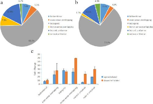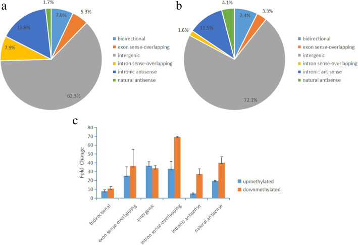 Fig. 3. Distribution of differentially methylated m6A sites of lncRNAs. a: Pie charts showing the percentage of up-methylated m6A peaks in six segments. b: Pie charts showing the percentage of down-methylated m6A peaks in six segments. c: Statistics of meanof the distribution positions of m6A-methylated lncRNAs in six segments with up- and down-methylated sites. Error bars represent the standard error of the mean
