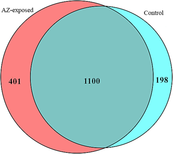 Fig. 1. Venn diagram showing the overlap of m6A peaks within lncRNAs in AZ-exposed and control groups
