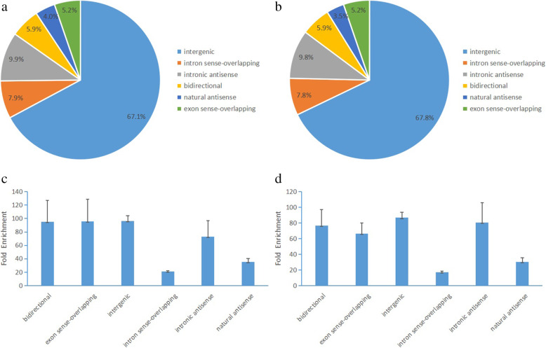 Fig. 2. Overview the distribution positions of m6A-methylated lncRNAs in the testes of X. laevis from control and AZ-exposed groups. a: Pie charts showing the percentage of the distribution positions of m6A-methylated lncRNAs relatived to its mRNA in control group. b: Pie charts showing the percentage of the distribution positions of m6A-methylated lncRNAs in AZ-exposed group. c: Distributions of mean fold enrichment of m6A-methylated lncRNAs in six segments in control group. d: Distributions of mean fold enrichment of m6A-methylated lncRNAs in six segments in AZ-exposed group. Error bars represent the standard error of the mean. The mean fold enrichment in the intergenic segments was the largest both in the control and AZ-exposed group with lower standard error of the mean