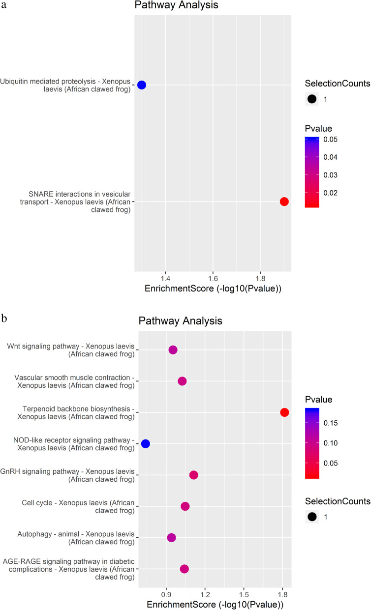 Fig. 4. The annotated significant pathways targeted by the enrichment score of the differentially m6A-methylated (up-methylated (a) and down-methylated (b)) lncRNAs-related genes in testis of X. laevis exposed to 100 μg/L AZ. The horizontal axis is the -LogP (logarithm of P-value) for the pathway and the vertical axis is the pathway category