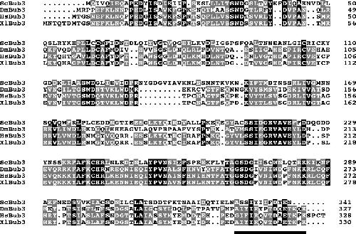 Alignment of Bub3 homologues. A Clustal alignment of Bub3 proteins from Saccharomyces cerevisiae (M64707), Drosophila melanogaster (AF106679), Homo sapiens (AF047473) and Xenopus laevis (AB018419/AF119790). Identical residues are shown in black and similar residues are highlighted in grey. The region against which the peptide antibodies were raised is underlined.