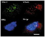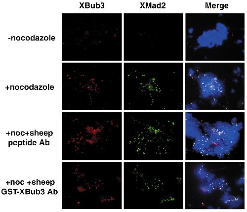 Effect of XBub3 antibodies on XBub3 and XMad2 localisation in egg extracts. Metaphase chromosomes were assembled in egg extracts and treated with (+noc) or without (-noc) nocodazole. Sheep peptide or full-length XBub3 antibodies were added to the extracts 90 minutes before nocodazole addition. Chromosomes were isolated through a 30% glycerol cushion onto coverslips and stained with a sheep peptide XBub3 antibody followed by a fluorescent anti-sheep antibody (-noc, +noc) or fluorescent anti-sheep antibody alone (+noc +sheep XBub3 peptide Ab, +noc +sheep GST XBub3 Ab) to detect the sheep antibodies pre-incubated in the egg extract. Co-staining with XMad2 was achieved by incubating the coverslips with the rabbit XMad2 antibody. Chromosomes were detected by mounting the coverslips in medium containing DAPI (DNA).