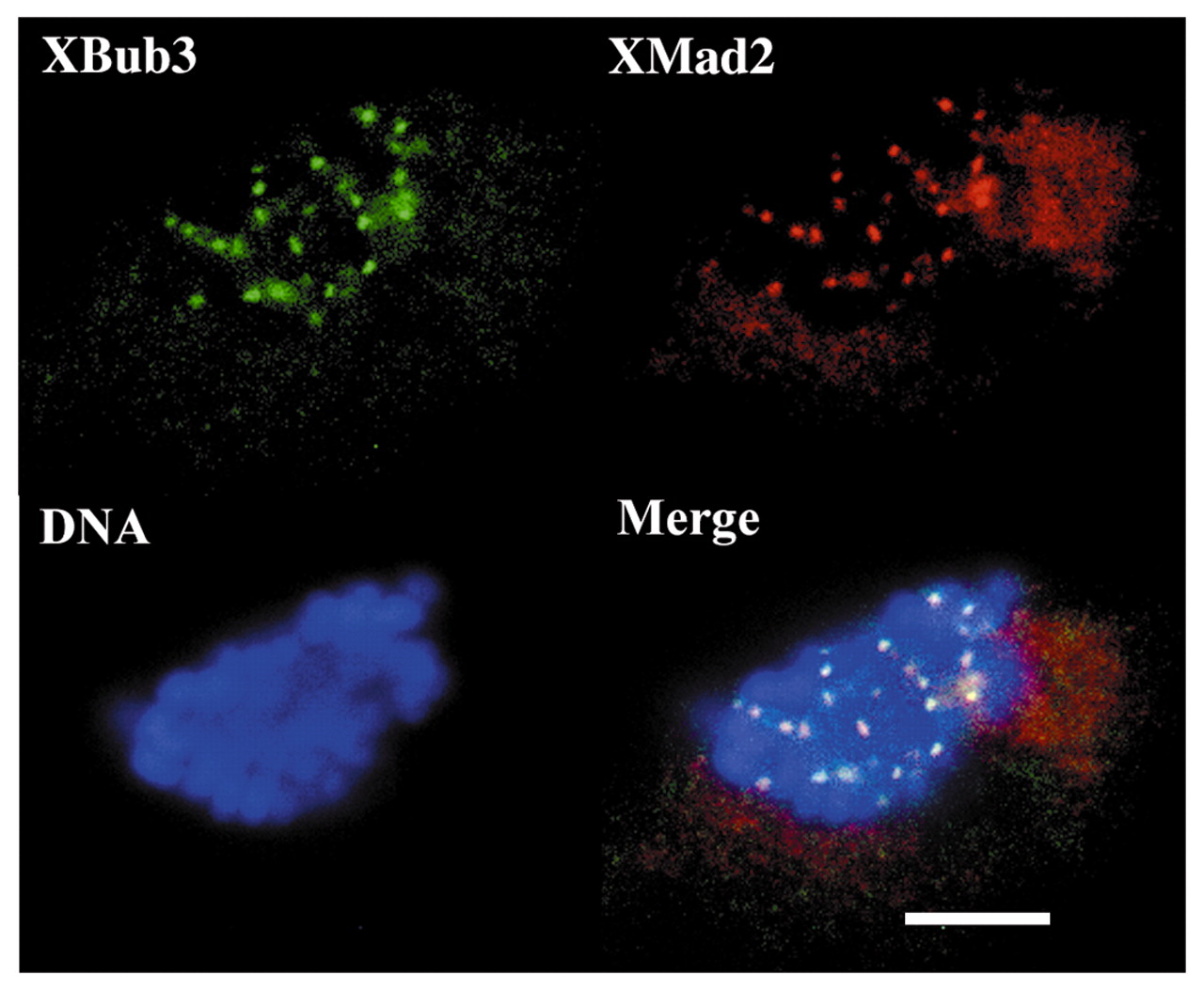 Colocalisation of XBub3 and XMad2 at kinetochores in nocodazole-treated XTC cells. XTC cells grown on coverslips were treated with 10 μg/ml nocodazole for 4 hours and then fixed and stained using rabbit XMad2 antibody (XMad2) and a sheep XBub3 peptide antibody (XBub3). The antibodies were detected using fluorescence-labelled secondary antibodies (XBub3 is green, XMad2 is red). Chromosomes were detected by mounting the coverslips in medium containing DAPI (DNA). The merge of all three fluorescent images is also shown. Bar, 10μ m