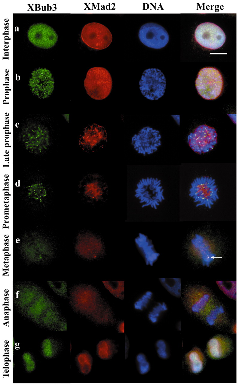 Localisation of XBub3 in asynchronous XTC cells. Asynchronously growing XTC cells were fixed and stained using rabbit polyclonal XMad2 antibody (XMad2) and a sheep XBub3 peptide antibody (XBub3). The antibodies were detected using fluorescent Alexa-labelled secondary antibodies. Chromosomes were detected by mounting the coverslips in medium containing DAPI. The merge of all three fluorescent images is also shown. Representative pictures of cell cycle stages are shown as judged by DAPI staining. A lagging chromosome is marked (row e) with an arrowhead. Bar, 10 μm.