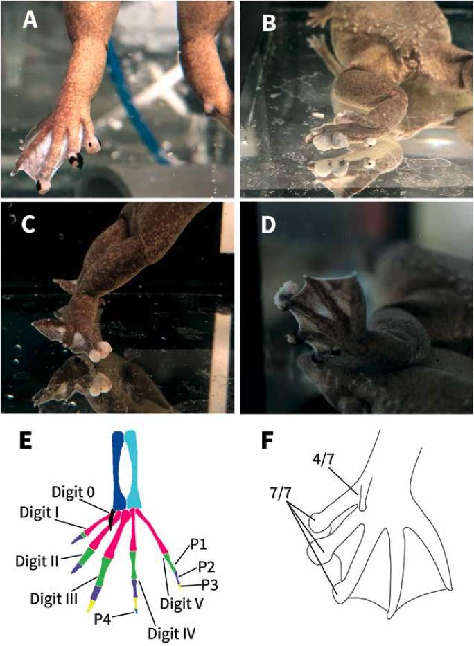 Figure 1. The gross figures of the feet of affected frogs. Four X. tropicalis displaying nodules on the distal aspects of the digits of the hindlimbs (A-D). The bone anatomy of a normal hindlimb (E). The normal X. tropicalis hind foot is characterized by: digit 0 shown in black, metatarsals in pink, tibiae in sky blue, fibulae in blue, first phalanx (P1) in green, second phalanx (P2) in purple, third phalanx (P3) in yellow, fourth phalanx (P4) in royal blue (on digit IV). Claws are only present on digits 0, I, II, and III. Note the normal, triangular-shaped distal phalanx. Hind foot dia- gram demonstrating which digits are the most affected (F). Seven frogs submitted directed to Stanford Necropsy Laboratory displayed nodules on the distal end of digits 0, I, II, III of the hindlimbs. None of the frogs displayed nodules on digits IV or V.
