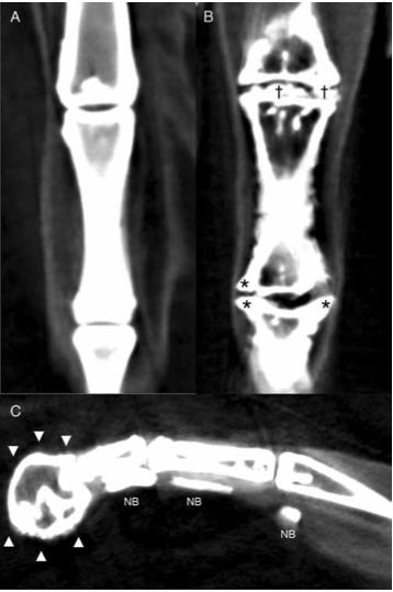 Figure 3. Reconstructed dorsal plane CT image of a normal MTP and IP joint (A), reconstructed dorsal plane CT image of a severely affected MTPjoint and IP joint (B) with periarticular new bone formation (as- terisks *) and new bone formation within the joint space (daggers â ), and reconstructed sagittal plane CT image of a severely affected digit (C) with a misshaped distal phalanx surrounded by a rim of new bone (arrowheads â²) and linear mineralization plantar to the digit within the extensor tendons (NB).
