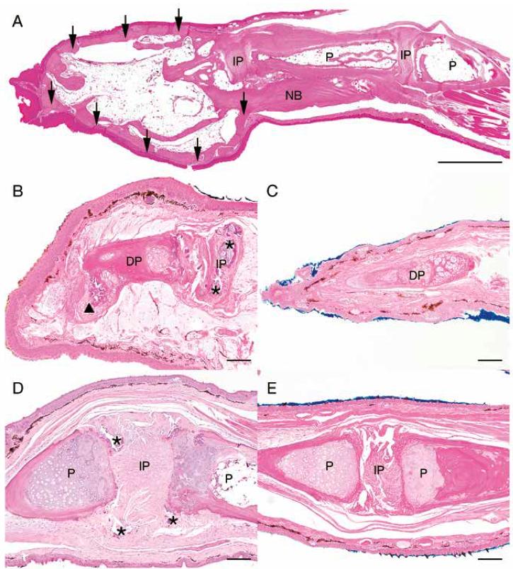 Figure 7. Histologic lesions in tarsal digits 0, I, II, and III of Xenopus tropicalis. Sagittal section of affected tarsal digit III (A). Nodular lesions comprised a peripheral rim of cortical bone (black arrows â) that occasionally extended proximally to form a layer of new bone (NB) surround- ing preexisting bone of the adjacent phalanx (P). Centrally, the nodule was composed of mature adipose tissue and scattered hematopoietic elements. H and E, scale bar = 1 mm. Bony remodeling of the distal phalanx and IP osteoarthritis (B). The distal phalanx (DP) is irregularly contoured with fibrocartilaginous metaplasia extending from the distal aspect (arrowhead â²). Myxedematous stroma surrounds the DP. The IP joint space contains abundant mineral (asterisks *). Note: The adjacent phalanx is out of the plane of section. H and E, scale bar = 100 μm. Unaf- fected DP (C). H and E, scale bar = 100 μm. An affected IP joint space exhibiting incongruity of adjacent phalanges (P) with IP mineralization (asterisks *) (D). H and E, scale bar = 100 μm. Normal adjacent phalanges, IP joint space (E). H and E, scale bar = 100 μm.