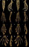 Figure 4. Reconstructed 3D volume renderings of a normal pes (A-D), a severely affected manus (E-H), a severely affected pes (I-L), and the most severely affected pes (M-P). A, E, I and M are dorsal views; B, F, J, and N are medial views, C, G, K, and O are palmar/plantar views, and D, H, L, and P are lateral views. A-D: Normal pes. E-H: Severely affected manus with severe periarticular and articular new bone formation in multi- ple MCP and IP joints with malangulation and subluxation of the IP joint. I-L: Severely affected pes that has rounded peripherally mineralized lesions on digits 0-III which extend proximal to the IP. There is severe linear mineralization plantar to digits I-IV in the flexor tendons. Similar to the manus, there is periarticular and articular new bone formation in the MTP and IP joints in the nonclawed digits and of the clawed digits proximal to the rounded lesions. M-P: Most severely affected pes with rounded peripherally mineralized lesions extending to the proximal phalanx, linear mineralization plantar to digits I-III, and severe periarticular new bone formation.
