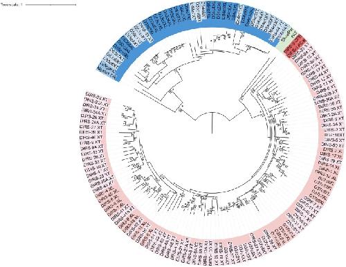 Figure 1. Sequence tree produced by neighbor-joining method (JTT + G), based on the amino acid sequences of the reverse transcriptase domain. The matrix was composed of the sequences of X. tropicalis and X. laevis DIRS elements obtained from the Rebpase database, the copies retrieved from both genomes and diagnostic sequences from each DIRS superfamily. The bootstrap values higher than 50 are indicated at the branches. The * sign near the nodes indicates the clade was supported with posterior probability higher than 80 in the Bayesian tree. Sequences of different superfamilies are highlighted in different colors and shades of each color also distinguish the sequences of X. tropicalis (XT) and X. laevis (XL).