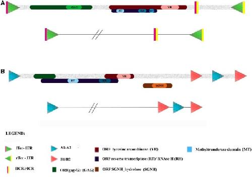 Figure 2. Schematic structure of the potentially complete DIRS-like and Ngaro-like retroelements of the Xenopus tropicalis genome. (A) Representation of the X. tropicalis DIRS-like elements, based on the Rebpase consensus sequences of the DIRS-37_XT, that contain three ORFs, conserved domains (gag, RT/RH/MT, and YR) and noncoding portions: inverted terminal repeats (ITRs) and internal complementary regions (ICRs). The expanded scheme of the terminal regions is shown in the lower plot. (B) Representation of the X. tropicalis Ngaro-like elements based on the Rebpase consensus sequences of the DIRS-53_XT that contain four ORFs, conserved domains (RT/RH, YR, and SGNH) and split direct repeats (SDRs).