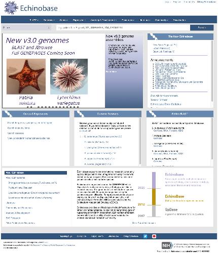 Figure 1. The Echinobase landing page and portal. A central feature of the page is an animated ‘news slider’ that presents a slide show of community news and new features of the resource. A horizontal navigation menu shared between all Echinobase pages provides consistency, and large ‘tiles’ of grouped content, e.g. ‘Genes and Expression’, ‘Genome Browsers’ and ‘BLAST’ aggregate commonly used tools and content.