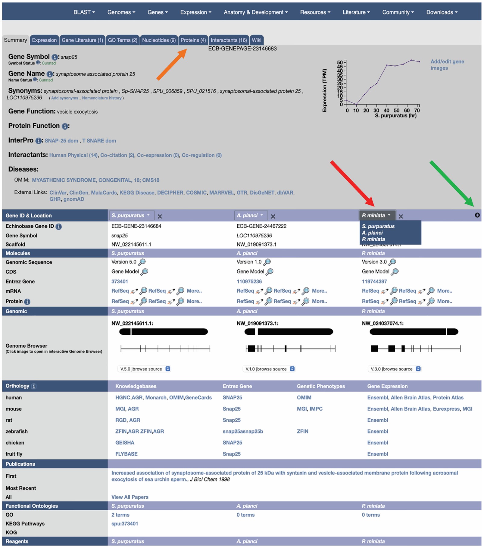 Figure 2. The Echinobase Gene Page. The top section of the page contains species agnostic information such as gene symbols, names and functions. It also contains synonyms, where legacy symbols and short names are stored and make genes locatable via database searches. The synonyms are also used to link Gene Pages to matched terms in the literature section. Due to the large amount of content aggregated on Gene Pages, much of the data is sorted into ‘tabs’ at the top of the page (orange arrow). Where a tab contains content, this is indicated by a numeral or icon. A transcriptional profile for the gene is also present, currently only for S. purpuratus, and will be expanded to additional species as data becomes available. The species specific content is arranged in vertical columns, each topped by a drop down menu that enables the user to define the content of that column (red arrow). In this example the third column header has been selected, displaying the three options for its content. The ‘+’ symbol highlighted by the green arrow allows additional columns to be displayed. As we will be adding both a fourth species and paralogs to the display options in the near future, the ability to customize the data viewed will become even more important. Where we store and integrate multiple genome versions, for example for S. purpuratus, the user can also select which genome version is displayed as a gene model via a drop-down menu, and which genome version is linked to the Gene Page in JBrowse. This is only the case when we have integrated multiple versions, and this is only the case in some species. As different genome builds (e.g. S. purpuratus v3.1 and v5.0) have different sets of gene models, not all genes will be available in all genome versions. When this happens the number of available genomes will change in the user display. The chromosome maps and gene model exon/intron graphics are generated dynamically from database content by JavaScript, and selecting a new genome version will dynamically display the new gene structure for the selected version. The rocket icon that appears adjacent to many sequence based hyperlinks will load the corresponding sequence into BLAST, while the magnifying glass icon will open the sequence in a display window.