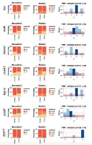Figure S2: No selection towards specific patterns of gene editing outcomes at suspected dependency target sites in apc CRISPR/Cas9-induced desmoid tumors for lox, mdk, hmmr, nuak1, fap-α, pclaf, pycr1. Gene editing outcomes at suspected dependencies demonstrate, for each gene, at least two tumors developing with biallelic frameshift mutations. Gene editing outcomes in desmoid tumors are in line, and probable according to binomial theory, with predicted gene editing outcomes as determined by the InDelphi algorithm. E.g for lox, given the editing outcomes as predicted by InDelphi, the probability of a single biallelic mutant desmoid tumor to have biallelic frameshift editing outcomes is 64%. The probability of sampling 66% (2/3 tumors) with biallelic frameshift lox status is likely (probability is 44%). Red demarcation represents a 10% probability interval. |