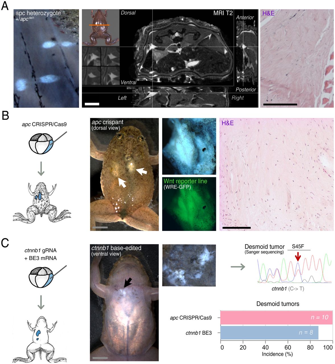 Fig. 1. Hyperactivation of the Wnt/β-catenin signaling pathway via truncation of Apc or constitutive activation of β-catenin induces desmoid tumors in X. tropicalis. (A) X. tropicalis carrying a germline heterozygous 1âbase pair deletion in the MCR of the apc gene (c.4120del, apcMCR-Î1/+) develop desmoid tumors with a 100% penetrance at 3 y of age (Left). The desmoid tumors present as T2 hyperintense foci on MRI (Middle, intersection of the crosshairs) and are characterized by classical desmoid tumor histopathology of long sweeping fascicles composed of uniform and slender fibroblasts/myofibroblasts (Right). (B) apc CRISPR/Cas9 injections in the vegetal-dorsal blastomere leads to mosaic mutant animals that manifest several desmoid tumors. These desmoid tumors exhibit active and high Wnt signaling activity as demonstrated by GFP expression using a Wnt reporter line (WntREs:dEGFP) (15) (Middle). Classical histopathology of desmoid tumors with long sweeping fascicles of bland fibroblasts/myofibroblasts exhibiting, in this case, local invasion into musculature (Right). (C) Injection of a BE3 cytosine base editor with a ctnnb1 gRNA leads to development of desmoid tumors. Sanger sequencing of a dissected desmoid tumor demonstrates base pair edits culminating in amino acid changes corresponding the human S45F mutation in CTNNB1 associated with sporadic desmoid tumorigenesis. Penetrance of desmoid tumors by 3 mo of age is 100% for apc CRISPR/Cas9-injected animals and 87.5% for ctnnb1 base-edited animals (Scale bar in histology picture, 100 µm). |