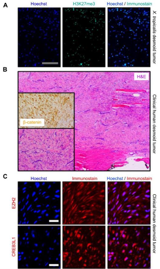 Figure S3: H3K27me3 immunoreactivity in X. tropicalis desmoid tumors. Further, immunostaining reveals CREB3L1 and EZH2 expression in clinical human desmoid tumors. (A) Xenopus tropicalis desmoid tumor cells demonstrate immunoreactivity for H3K27me3. Grey scale bar is 200 μm. (B) Representative photomicrograph for three case studies of desmoid tumors employed for immunostainings in this study. First, irregular infiltration of DT cells into adjacent skeletal muscle could be noted. (Inset) Higher resolution investigation revealed proliferation of elongated, slender, spindle- shaped cells of uniform appearance, set in a collagenous stroma containing prominent blood vessels. The cells lack nuclear hyperchromasia or cytological atypia and are arranged in long sweeping bundles. (Inset; β-catenin) The spindle cells show cytoplasmatic and nuclear positivity for β-catenin. Taken together, these histopathological hallmarks were compatible with the diagnosis of DT in all three case studies. Immunostaining on these clinical samples revealed both nuclear and cytoplasmatic reactivity with anti-EZH2 (C-top) and anti-CREB3L1 (C-bottom) antibodies. Please note that CREB3l1 is normally inserted into ER membranes, with the N-terminal DNA-binding and transcription activation domains oriented toward the cytosolic face of the membrane. Upon activation and cleavage in the Golgi, the CREB3L1 N-terminal fragment will translocate to the nucleus. The CREB3L1 N-terminal-reactive antibody (AF4080; Rndsystems) demonstrates both nuclear and cytoplasmatic immunoreactivity indicative for a role of CREB3L1 as an active transcription factor in desmoid tumors. Shown immunofluorescence is representative for all three desmoid tumor case studies. White scale bar is 20um |