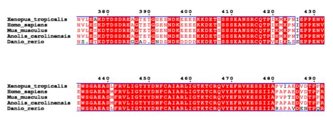 Fig. S4: Cross-species multiple sequence alignment for EZH2 protein. Ezh2 from Xenopus tropicalis shares 96% sequence identity with the AcEZH2 used to assemble the structural template in Fig 4B. Further are the regions containing mutations 100% conserved between human EZH2, X. tropicalis Ezh2 and AcEZH2 (see alignment). Following UniProtKB entries were used: Q61188 (EZH2_MOUSE), Q15910 (EZH2_HUMAN), R4GB81 (R4GB81_ANOCA), Q08BS4 (EZH2_DANRE), Q28D84 (EZH2_XENTR). |