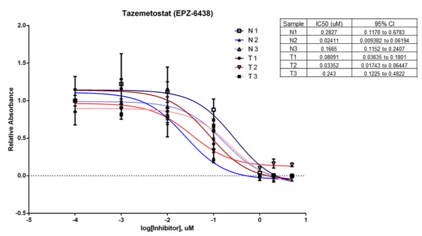 Fig. S6: Proliferation characteristics of three desmoid tumor cell lines (T1-3) and three matched normal fibroblast cultures (N1-3) are similar after tazemetostat treatment. Dose-response curve for two-week treatments with Tazemetostat at the following concentrations: 5 μM, 2 μM, 1 μM, 0.1 μM, 0.01 μM, 0.001 μM, 0.0001 μM. Shown is absorbance at 370 nm relative to BrdU incorporation added 18h before experiment end-point. Non-linear regression of âRelative Absorbance vs. log[Drug]â and IC50 calculations were conducted using GraphPad Prism. Error bars are standard deviation. 95% confidence intervals of IC50 are reported in the table. |