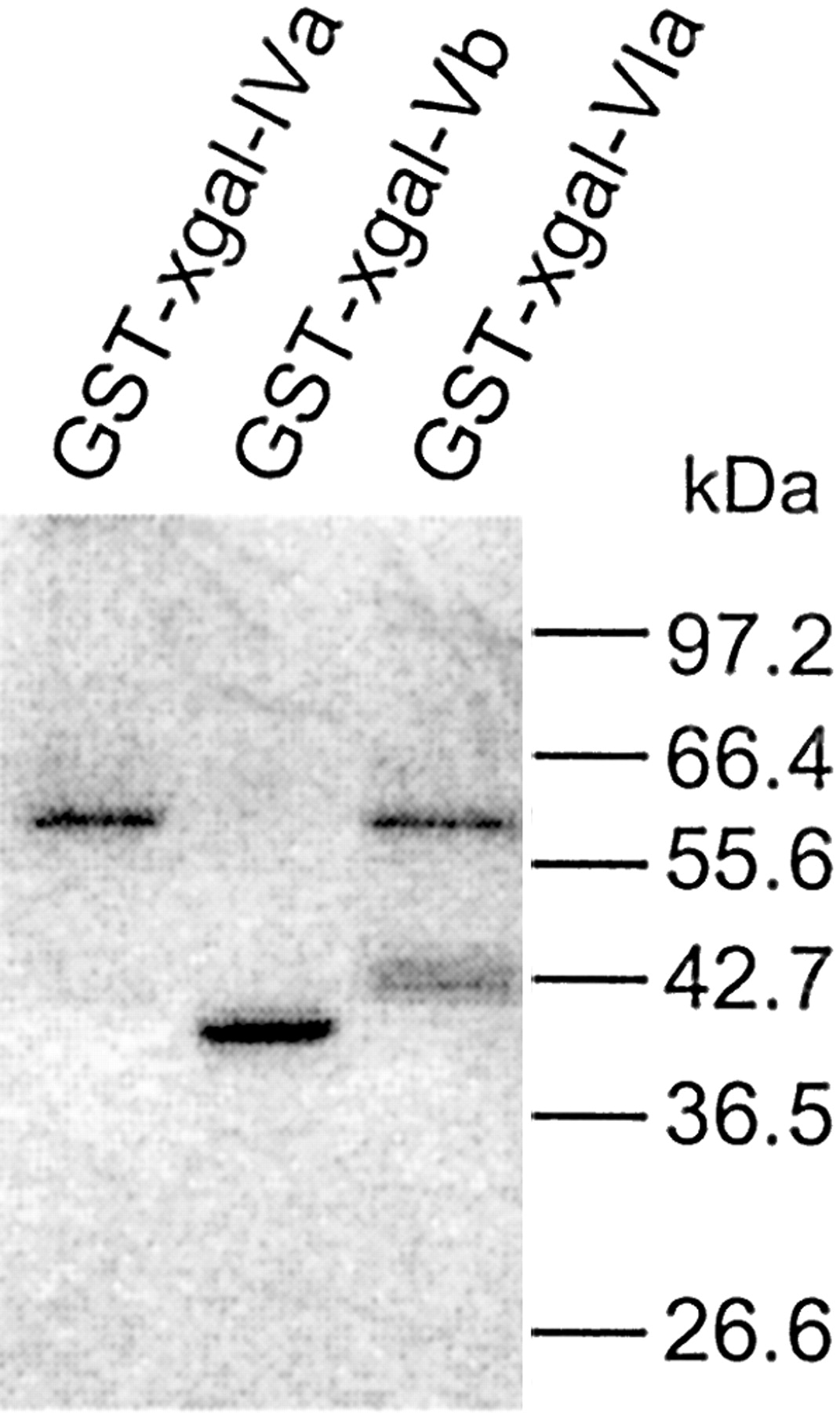 62.8 kDa; GST/xgalectin-Vb, 41.4 kDa; and GST/xgalectin-VIa, 61.4
