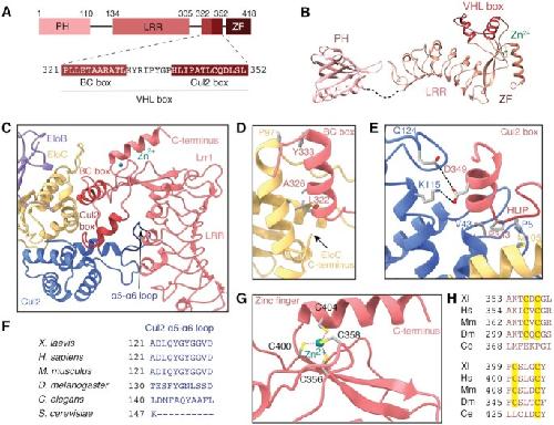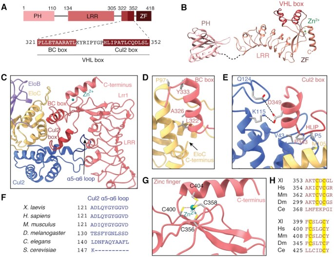 Figure 2. Interaction between Lrr1 and Cul2:EloBC. (A) Domain architecture of X. laevis Lrr1, showing the sequence of the BC and Cul2 boxes. (B) Atomic model of Lrr1. The model of the PH domain is predicted by AlphaFold, whereas the models of the LRR, VHL box and zinc finger domains were derived from the experimentally determined cryo-EM map. The dashed line indicates a flexible linker. (C) Overview of the interactions that Lrr1 makes with Cul2 and EloC. (D) Details of the interaction between the Lrr1 BC box and EloC. (E) Details of the interaction between the Lrr1Cul2 box and Cul2 and EloC. (F) Sequence alignment of the Cul2 α5âα6 loop that interacts with the LRR domain of Lrr1. (G) Organization of the Lrr1 zinc finger showing tetrahedral coordination of a zinc cation. (H) The cysteine residues of the zinc finger (highlighted in yellow) are conserved in vertebrates and flies but absent in Caenorhabditis elegans.