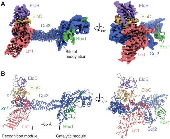 Figure 1. Structure of CRL2Lrr1. (A) Two views of the cryo-EM map of CRL2Lrr1 (State 1) with each of the five subunits uniquely colored. The site of Cul2 neddylation is marked with an asterisk. (B) Atomic model of CRL2Lrr1 derived from the cryo-EM map.