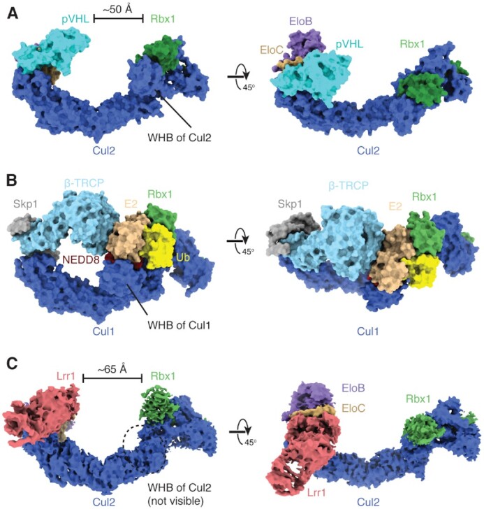 Figure 3. CRL2Lrr1 adopts an open conformation. (A) Surface representation of an atomic model of the unneddylated CRL2pVHL complex generated by docking two crystal structures (PDB 4WQO and PDB 5N4W) (33,34). (B) Surface representation of the atomic model of the neddylated CRL1β-TRCPâUBE2DâUbâsubstrate complex (PDB 6TTU) (30) in a closed conformation, in which the substrate-recognition subunit β-TRCP makes direct contacts with the E2âUb conjugate. (C) Cryo-EM map of neddylated CRL2Lrr1 colored by subunit. The structure forms an open conformation with the LRR domain of Lrr1 â¼65 à from the RING domain of Rbx1 that catalyzes ubiquitin transfer even at their closest point. The WHB domain of Cul2 is not visible in the cryo-EM map.