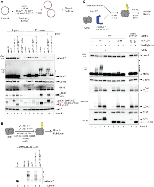 Figure 4. The PH domain of Lrr1 is crucial for CRL2Lrr1 function. (A) The Lrr1 PH domain is essential for Mcm7 polyubiquitylation, CMG unloading and CRL2Lrr1 recruitment to the replisome in egg extracts. Plasmid DNA was replicated in the indicated extracts in the presence or absence of p97i. After 45 min, the plasmid was recovered, and samples were processed for immunoblotting with the indicated antibodies. Histone H3 was used as a loading control. (B) The Lrr1 PH domain is required for CMG polyubiquitylation in the absence of DNA. rCMG was added to the indicated egg extracts containing p97i and His-tagged ubiquitin (His-Ub). After 40 min, His-Ub was recovered, and samples were immunoblotted with Mcm7 antibody. (C) The Lrr1 PH domain is required for CMG polyubiquitylation in a reconstituted system. rCMG or rCMGK27/28R was preincubated with neddylated or unneddylated rCRL2Lrr1 or rCRL2Lrr1ÎPH, as indicated. Reactions were initiated by the addition of a ubiquitin master mix containing E1, E2 and ubiquitin, followed by incubation at 37°C. Usp2, a deubiquitinating enzyme, was added to confirm that the shifted Mcm7 species were indeed ubiquitylated. Samples were immunoblotted with the indicated antibodies.