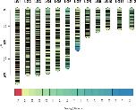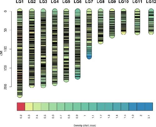 Figure 4. The Bombina linkage map. The linkage map was visualized with LinkageMapView (v. 2.1.2) (Ouellette et al. 2018). Horizontal bars represent marker loci. Colors indicate marker density in cM/locus from 0.2 (red) to 2.1 (blue). This figure is best viewed at maximum magnification. |
