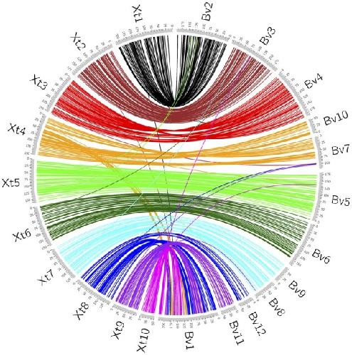 Figure 6. Synteny between B. variegata and X. tropicalis. Circos (v0.69-6) (Krzywinski et al. 2009) plot of 737 B. variegata target sequences from the 12 LGs (Bv, unit is cM) aligned against the X. tropicalis genome assembly (Xt, unit is Mb) with BLAST+ (v. 2.9.0) (Camacho et al. 2009). |