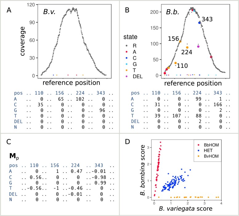 Figure 2. Polarization of the raw read coverage. The top two plots show the raw read coverage along the reference sequence of locus 332172 for F0 B. variegata (A) and F0 B. bombina (B). The B. variegata individual is homozygous for the reference state (R) at all sequence positions, whereas the B. bombina individual has a number of variants. Two homozygous (156 and 343) and two heterozygous (110 and 224) variant positions are highlighted. For these four, the matrix entries are listed below the plots. A polarized matrix, Mp, is computed from these read counts (see text, C), in which sequence states associated with B. variegata have positive entries and sequence states associated with B. bombina have negative entries. For each sample, raw read counts are then multiplied by Mp. Average positive entries and average negative entries result in a B. bombina score and a B. variegata score, respectively, and when plotted in a coordinate system (D), samples can be assigned to three clusters representing BbHOM, HET, and BvHOM. Note that the heterozygous variants (B) do not interfere with the clustering into three diplotypes. |