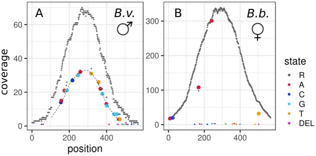 Figure 8. Raw read coverage at locus 5568 in the F0 generation. Plots follow the format of Figure 2: raw read coverage (y-axis) is shown for each reference position (x-axis) and sequence state (R = reference state) for F0 B. variegata (A) and F0 B. bombina (B). Nonreference states are highlighted in color. Variants in the sex-linked haplotype (A) are connected with a dashed line. |