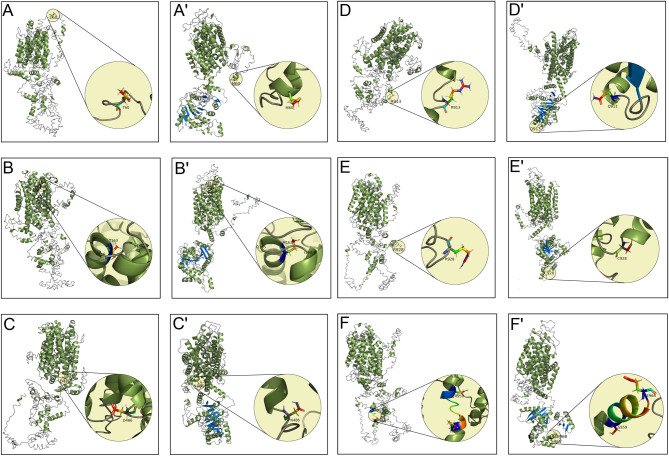 Figure 3. Predicted configuration of WT and six frequent mutant hNCC proteins. Figures A–F are configurations of WT hNCC proteins with local amplification of T60 (A), T163 (B), D486 (C), R913 (D), R928 (E), and R959 (F). Figure A′–F′ are the configurations of corresponding mutant hNCC proteins with local amplification of M60 (A′), M163 (B′), N486 (C′), Q913 (D′), C928 (E′), and 959frameshift (F′).