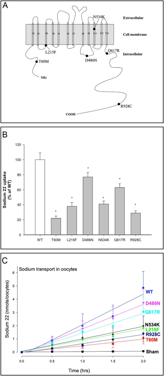 Figure 5. Location of the six studied SLC12A3 mutations in the predicted hNCC protein and the result of 22Na+ uptake experiment. (A) The schematic topological representation of hNCC consists of the intracellular N- and C-terminal domains and 12 transmembrane segments. We studied the function of the mutations labeled T60M, L215F, D486N, N534K, Q617R, and R928C. (B) Metolazone-sensitive 22Na+ uptake was measured in oocytes injected with H2O, WT (open bars), or mutant SLC12A3 cRNAs (black bars). The uptake values are shown as percentages of WT 22Na+ transport (WT was set as 100%). (C) Time course of 22Na+ uptake in WT and hNCC mutant-injected X. laevis oocytes. X. laevisoocytes were microinjected with the following SLC12A3 cRNAs: WT, sham, and mutants T60M, L215F, D486N, N534K, Q617R, and R928C. Data were presented as the mean ± s.e.m. and compared using unpaired t-tests. *P< 0.05 indicates a significant difference compared with WT SLC12A3-injected oocytes. Each data point represents the mean value of 10–15 oocytes.