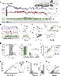 (F) Relation between the instantaneous frequency of the forelimb (dark green dots) or the hindlimb (light green dots) and the left horizontal eye movements (righteye versus leftforelimb, R = 0.7248, Spearman test, p < 0.001, r2 = 0.5253; righteye versus lefthindlimb, R = 0.3195, Spearman test, p = 0.0852, r2 = 0.1021).