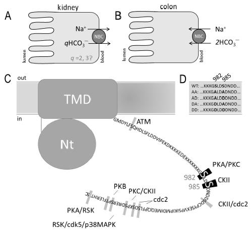 Figure 1. Predicted phosphorylation sites in the cytoplasmic C-terminus of NBCe1. (A) The mode of action of NBCe1-A in the basolateral membranes of renal proximal tubule epithelia. HCO3− is generated in the cytosol by ammoniagenesis and the action of carbonic anhydrase II; (B) The mode of action of NBCe1-B in the basolateral membranes of colonic crypt epithelia. The process of HCO3− secretion into the lumen is completed via numerous apical anion transporters and channels [13]; (C) Graphic representation of NBCe1-A showing the cytoplasmic amino (Nt) and carboxy (Ct) terminal domains in relation to the transmembrane domain (TMD). Ct is not shown larger than scale in order to present the primary sequence. Highlighted residues were predicted to be phosphorylated (probability > 0.5) by the NetPhos 3.1 server (http://www.cbs.dtu.dk/services/NetPhos/, accessed on 24 February 2021). Black highlighted residues 982 and 985 were demonstrated to be phosphorylated by a phosphoproteomic study of rat kidney cortices [14]. ATM = ATM kinase. PKA, PKB, PKC = protein kinases A, B, and C. cdc2 = cyclin-dependent kinase 1. cdk5 = cyclin-dependent kinase 5. CKII = casein kinase II. p38MAPK = p38 mitogen-activated kinases. RSK = ribosomal S6 kinases; (D) The sequence of mutant clones studied in the present work.