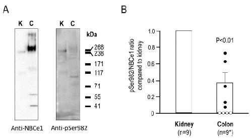 Figure 3. Probing the pSer982 status of kidney and colonNBCe1. (A) Western blot showing anti-NBCe1 immunoreactivity and anti-pSer982 immunoreactivity in protein lysates from murine kidney (2 µg/lane) or colon (10 µg/lane); (B) Quantification of the ratio of pSer982/NBCe1 in colon versus kidney. Open circles represented null data points due to undetectable pSer982 immunoreactivity in colon and were excluded from the statistical analysis shown.