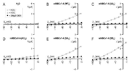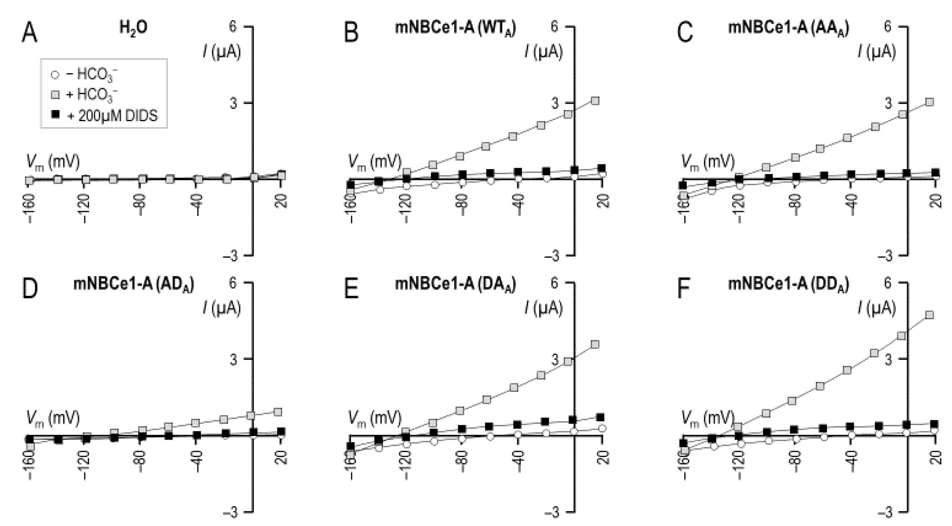 Figure 4. I–V relationships for oocyte expressing (de)phosphomimetic NBCe1-A clones. Each panel shows data gathered from a single representative oocyte injected with either (A) H2O, (B) cRNA-encoded wild-type NBCe1-A, or (C–F) cRNA encoded with one of five (de)phosphomimetic mutants. Open circles are I–V data gathered from oocytes during perfusion with our CO2/HCO3−-free solution, gray squares are I–V data gathered during perfusion with our CO2/HCO3−-containing solution, and black squares are I–V data gathered during perfusion with our CO2/HCO3−-containing solution plus 200 µM DIDS.