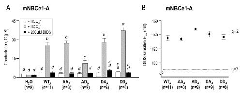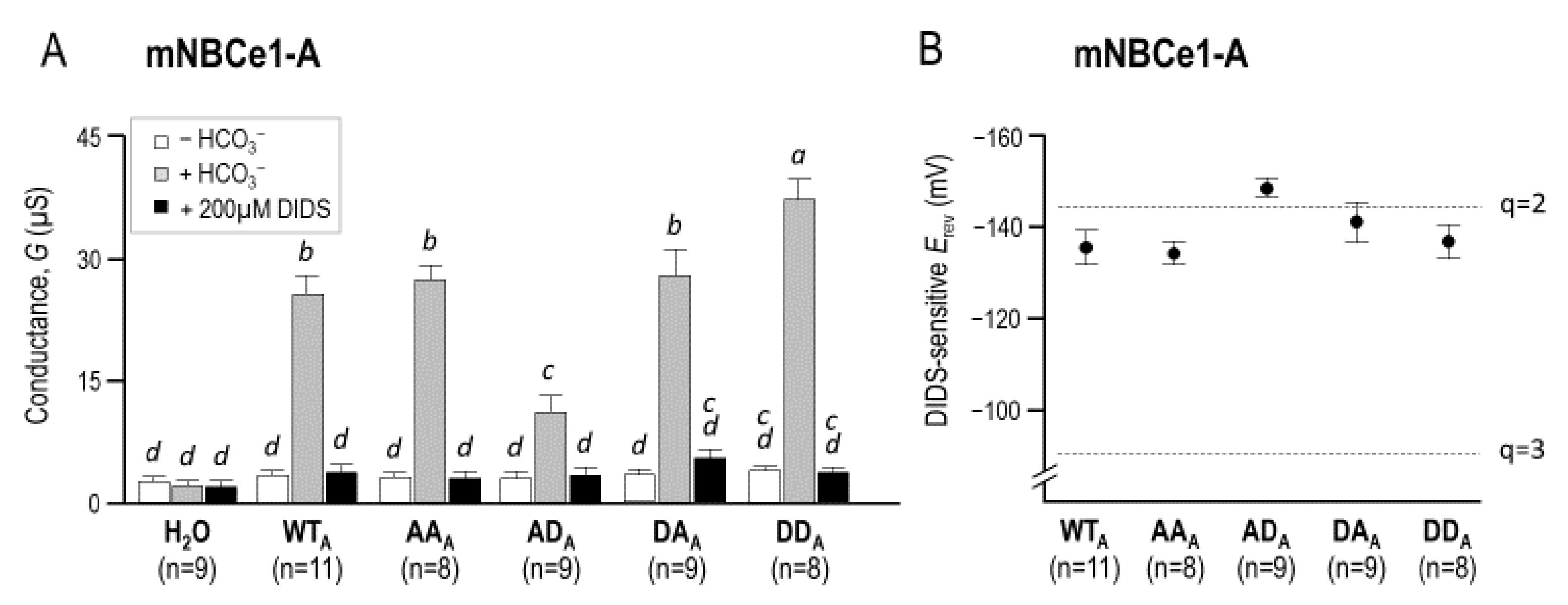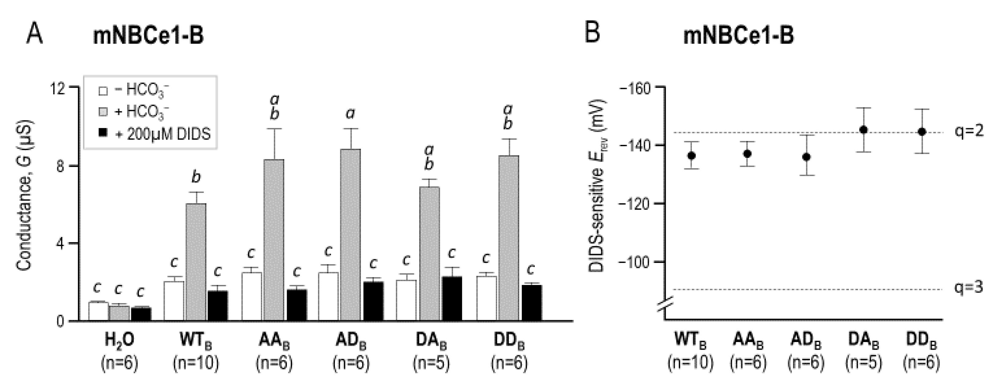 Figure 8. The conductance and stoichiometry of (de)phoshomimetic NBCe1-B clones in Xenopus oocytes. (A) The membrane conductance of a larger number of oocytes calculated from data, such as those show in Figure 7. Letters above bars indicate statistically indistinguishable groups (i.e., groups with different letter were significantly different from each other); (B) The reversal potentials of wild-type NBCe1-B and the four (de)phosphomimetic mutants plotted against the reversal potentials that correspond to predicted transport stoichiometries of 1Na+–3HCO3− (q = 3) and 1Na+–2HCO3− (q = 2).