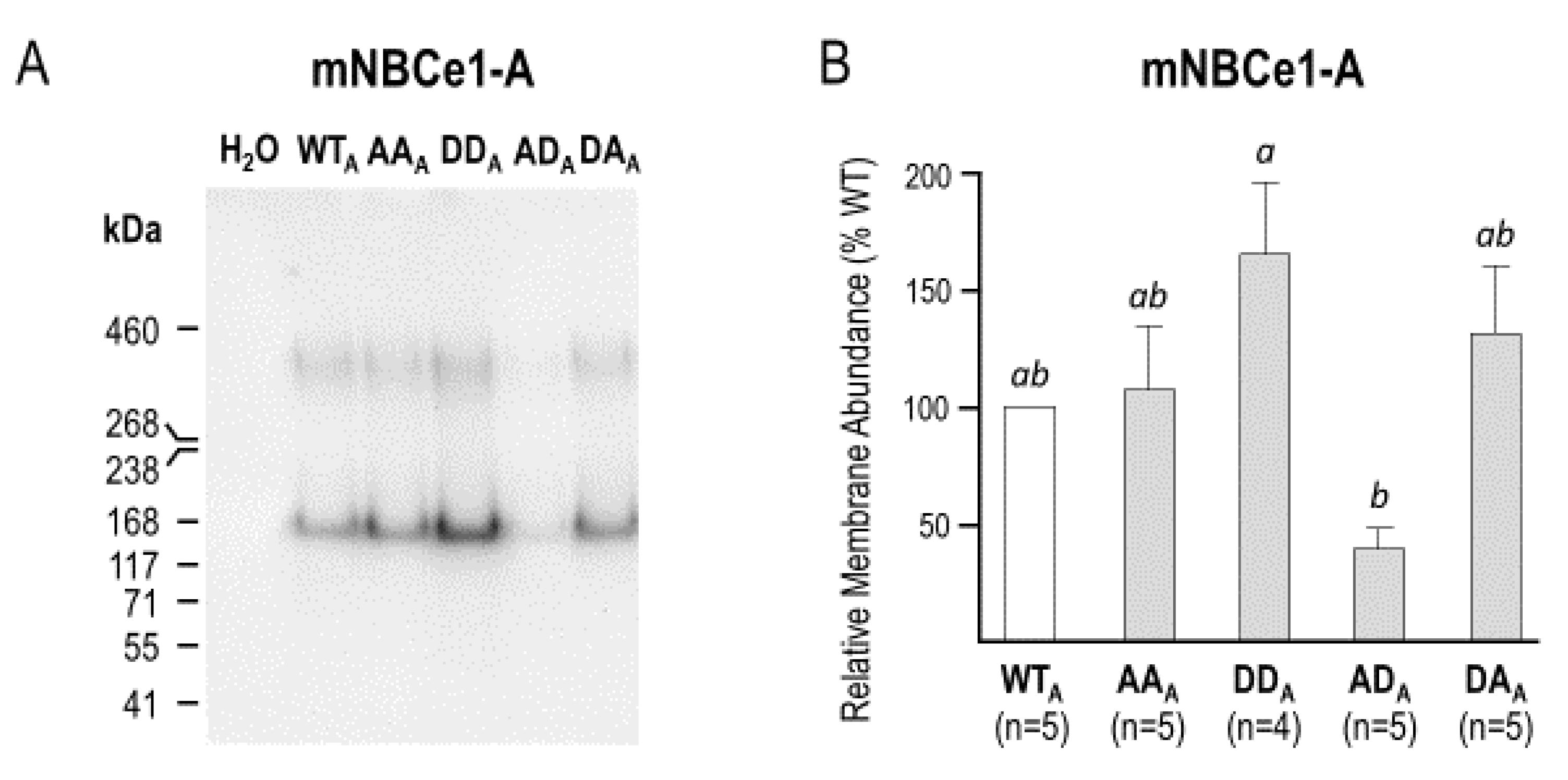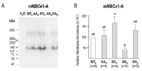 Figure 6. The relative membrane abundance of (de)phosphomimetic NBCe1-A clones in Xenopus oocytes. (A) Western blot showing EGFP immunoreactivity in biotinylated protein fractions (i.e., cell-surface-expressed) NBCe1-A-EGFP from Xenopus oocytes; (B) Quantification of the relative plasma-membrane expression of (de)phosphomimetic mutants of NBCe1-A, as compared to wild-type. Letters above bars indicate statistically indistinguishable groups (i.e., groups with different letter were significantly different from each other).